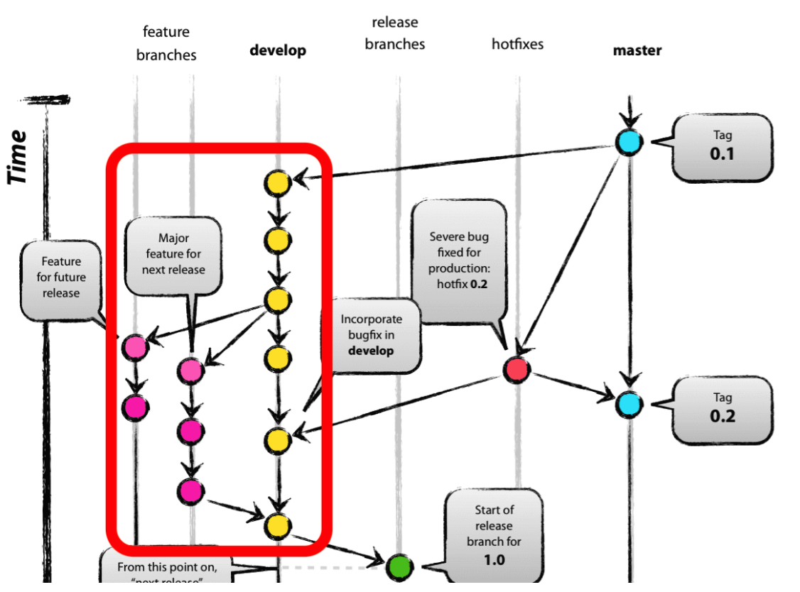 - feature 브랜치가 다시 합쳐지는곳 : develop