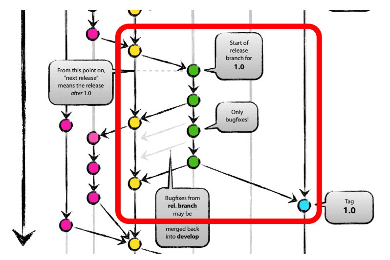 develop 브랜치에 버전에 포함되는 기능이 merge 되었다면 테스트를 위해 develop 브랜치에서 부터 release 브랜치를 생성한다.