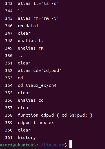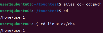| alias 이름='명령1;명령2;...' | 여러 명령을 하나의 이름으로 사용하는 경우다 |