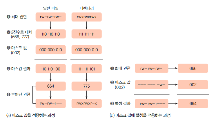 - 마스크값은 파일이나 디렉터리 생성 시 부여하지 않을 권한을 말한다.