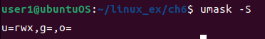 - 예를 들어 위의 077 마스크값은 파일이나 디렉터리 생성시 700 권한을 부여한다는 말이다. 아래는 마스크값을 문자로 출력한 umask 명령이다.