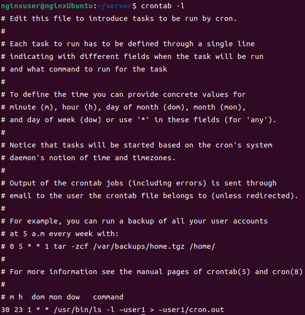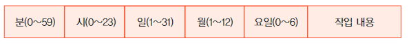 - crontab 파일에는 여러 개의 작업을 저장할 수 있으며 한 행에 하나의 작업을 설정한다.