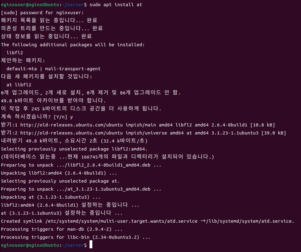 - at 명령이 설치되어 있지 않다면 아래와 같이 설치한다.