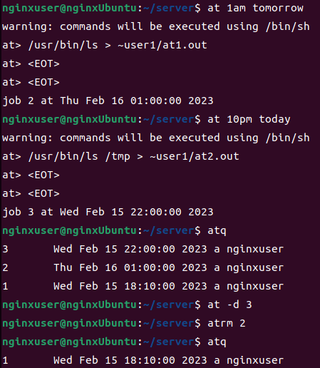 | -r 작업 번호 | 현재 실행 대기 중인 명령 중 해당 작업 번호를 삭제한다(atrm과 동일). |