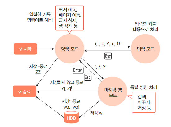 - vi의 모드는 입력 모드, 명령 모드외에 마지막행 모드가 있다.