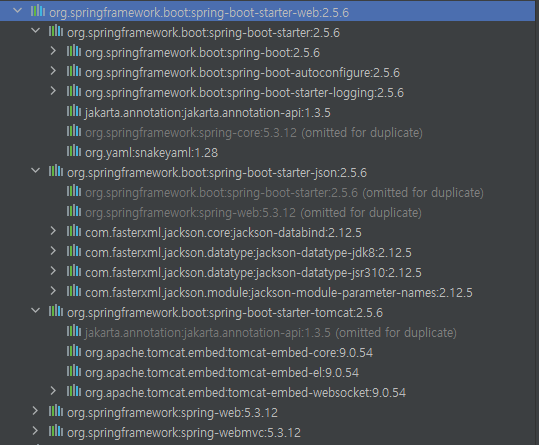 스프링 프레임워크에서는 개발에 필요한 모듈의 의존성을 직접 설정해야하며 호환되는 버전을 찾아서 명시해줘야 했습니다. 하지만 스프링 부트에서는 자주 사용되고 서로 호환되는 버전의 모듈 조합을 제공되어 라이브러리 호환 문제를 해결 할 수 있습니다. 아래는 spring-boot-starter 모듈 중 'spring-boot-starter-web'이 제공하는 의존성 호환 조합의 일부입니다.